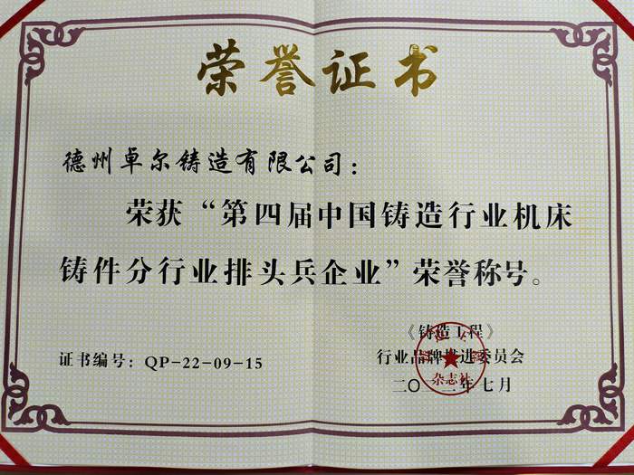 2022年7月25日,第九屆全國鑄造行業(yè)發(fā)展論壇暨中國鑄造協(xié)會第九界會議代表大會在天津勝利召開,德州卓爾科技有限公司榮獲“第四屆中國鑄造行業(yè)排頭兵企業(yè)”及“第四屆鑄造行業(yè)機(jī)床鑄件分行業(yè)排頭兵企業(yè)”榮譽(yù)稱號