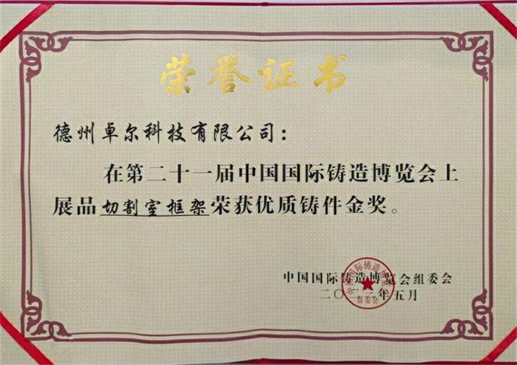 此次參展鑄件榮獲金獎(jiǎng),是德州卓爾科技有限公司作為“高新技術(shù)企業(yè)”、“山東省創(chuàng)新型中小企業(yè)”、“山東省科技型中小企業(yè)”、“山東省專精特新中小企業(yè)”的實(shí)力證明。德州卓爾科技有限公司將以此次參展鑄件榮獲金獎(jiǎng)為契機(jī),不斷加大科技研發(fā)投入,強(qiáng)化技術(shù)創(chuàng)新,增強(qiáng)核心競(jìng)爭(zhēng)力,促進(jìn)行業(yè)轉(zhuǎn)型升級(jí),持續(xù)推動(dòng)公司高質(zhì)量發(fā)展,為區(qū)域經(jīng)濟(jì)發(fā)展做出新的更大的貢獻(xiàn)。